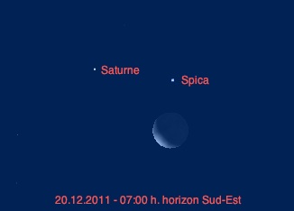 À cette période de l’année (décembre 2011), tu peux voir Saturne à l’oeil nu dans le ciel du matin, avant le lever du jour. Elle se trouve proche de l’étoile Spica de la Vierge. Si le ciel est dégagé, regarde vers l’horizon Sud-Est le 20 décembre, vers 07:00 du matin : tu y verras la Lune, Spica et Saturne, comme sur l’image ci-contre.