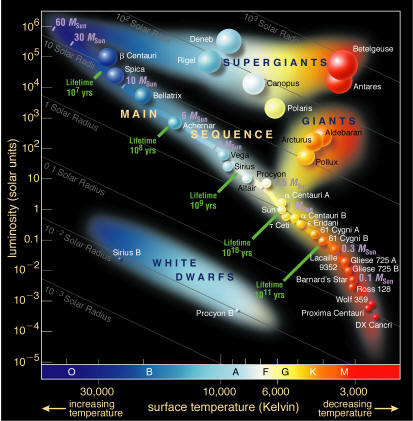 Il en est de même pour les étoiles. Une étoile rouge sombre est de basse température de surface. Une étoile rouge vif est plus chaude, mais pas autant qu’une étoile jaune comme le Soleil dont la surface est à près de 6000 degrés ! Une étoile orange est encore plus chaude, puis viennent les étoiles blanches ou bleues qui sont vraiment très très chaudes !