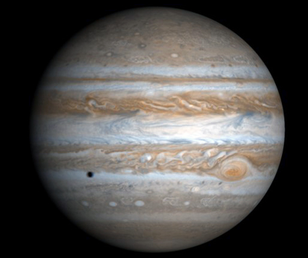 C’est vrai que Jupiter possède de superbes couleurs chaudes, organisées en grandes bandes qui ceinturent cette planète géante. Il s’agit en fait de gigantesques systèmes de nuages et de gaz qui tournent autour de la planète. Leurs couleurs sont à la fois le reflet de leur altitude, de leur composition chimique et des subtiles interactions entre ces nuages, la lumière du Soleil et le champ magnétique de Jupiter. Les sommets des nuages sont souvent de couleur rouge alors que les nuages situés en profondeur sont plutôt bleutés, les nuages marrons et blancs correspondant à des altitudes intermédiaires. L’atmosphère de Jupiter est composée de 90 % d’hydrogène, 10 % d’hélium, ainsi que de traces d’ammoniac, de méthane, de vapeur d’eau. Ces différentes substances, en se combinant entre elles avec plus ou moins de stabilité, donnent ses couleurs à l’atmosphère de Jupiter : les couleurs brunes et orangées de la planète sont dûes à de l’hydrogénosulfure d’ammonium, la célèbre Grande Tache Rouge contenant des dérivés de phosphore. La glace d’ammoniac se trouve surtout dans les couches nuageuses les plus externes, l’hydrogénosulfure d’ammonium compose la couche suivante et, plus profondément, on trouve des nuages de glace et d’eau. Et en-dessous ? On n’en sait trop rien...
