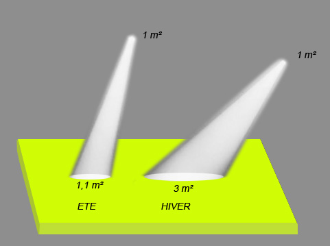 Par contre, en hiver, c’est le contraire, le Soleil ne monte pas bien haut et ses rayons font un angle bien plus faible, de l’ordre de 20° au-dessus de l’horizon