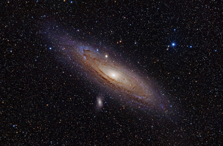 Eh bien, mon cher, si tu veux faire un grand voyage, fais celui-là. La lumière met 2,6 millions d’années pour nous arriver de la galaxie d’Andromède, notre voisine. Tu peux la voir en ce moment cette galaxie, dans la constellation d’Andromède, si tu as de bons yeux, car elle est très faible. Avec des jumelles, elle est très visible. C’est l’objet le plus lointain que l’on peut voir à l’oeil nu. La vitesse de la lumière n’est pas celle d’un escargot ! Elle fait 300 000 km par seconde ! Pour aller à la Lune il lui faut 1,3 seconde et pour aller au Soleil 8 minutes, mais pour notre galaxie voisine 2,6 millions d’années ! Mesure la différence et mesure surtout le grand vide qui nous en sépare ! Mais là-haut, pas de problème, il y a de la place ! Bon voyage !