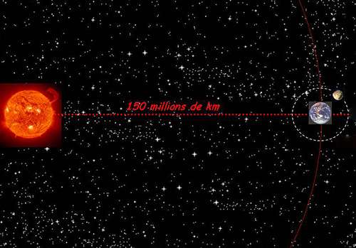 Si tu choisis l’échelle 1:1000’000’000, le Soleil se trouvera à 150 mètres de la Terre, la Lune sera à 30 cm. Voilà donc une échelle qui te demande de représenter ce schéma sur le terrain. Si tu veux le faire sur une grande feuille blanche, il faudra une échelle 100 x plus petite : le Soleil serait placé à 1,5 m de la Terre et la Lune …à 3 mm de la Terre. Donc, sur une feuille A4, ce n’est pas vraiment possible, ou du moins pas lisible, car la Lune serait collée à la Terre alors que celle-ci se trouverait à 15 cm du Soleil.