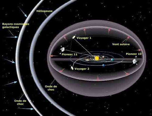 Une autre définition de la frontière du Système solaire est celle de l’héliosphère. L’héliosphère est une gigantesque bulle de gaz dans laquelle les particules émises par le Soleil (le vent solaire) repoussent celles du milieu interstellaire. La frontière est l’endroit où le vent solaire n’est plus capable de repousser le gaz interstellaire. Si l’on considère la frontière de l’héliosphère comme celle du Système solaire, son rayon est d’environ 75 à 90 unités astronomiques, ce qui fait entre 11 et 13 milliards de kilomètres.