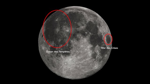 La formulation de ta question montre déjà que tu sais qu’il n’y a pas de mers à proprement parler sur notre satellite naturel qu’est la Lune. Ce sont des astronomes italiens, Grimaldi et Riccioli, qui ont donné ces noms curieux de « mare » aux mers lunaires au 17e siècle. Et c’est très probablement parce que ces zones plus sombres et étalées ressemblent visuellement à de grandes surfaces d’eau qu’ils les ont nommées ainsi. En plus, pour les plus importantes et faciles à observer depuis la Terre, ces mers ont reçu de très jolis noms : mer des Pluies, mer de la Sérénité, mer de la Tranquillité, mer des Crises, mer des Nuages, mer des Humeurs,… Tu peux tenter d’identifier la plus facile d’entre elles : la mer des Crises ; elle est de moyenne grandeur, presque ronde et se trouve sur le bord supérieur droit de la Lune.